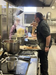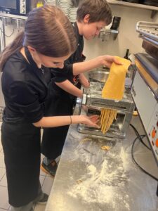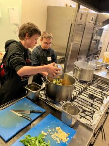 Nach einer kurzen Einweisung in die Lebensmittelkunde und die Hygienestandards der Gastronomie durften die Schüler*innen selbst aktiv werden. Dabei standen Aufgaben auf dem Plan, die weit über das Aufwärmen einer Pizza hinausgingen: Kochen mit frischen und regionalen Zutaten! Die Teilnehmenden lernten schnell, dass Sauberkeit und Struktur die Grundpfeiler jeder erfolgreichen Profiküche sind.